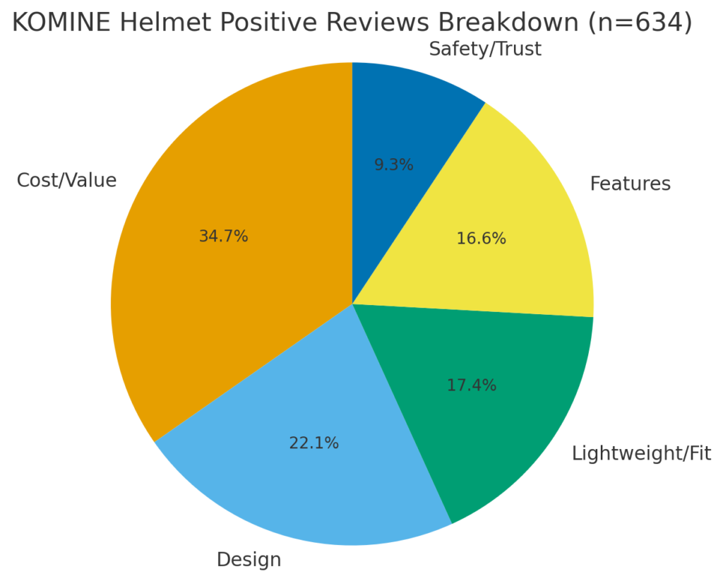コミネのヘルメットは、全体の87%にあたる634件がポジティブなレビューでした。ここでは、それらをカテゴリごとに分けて見ていきます。