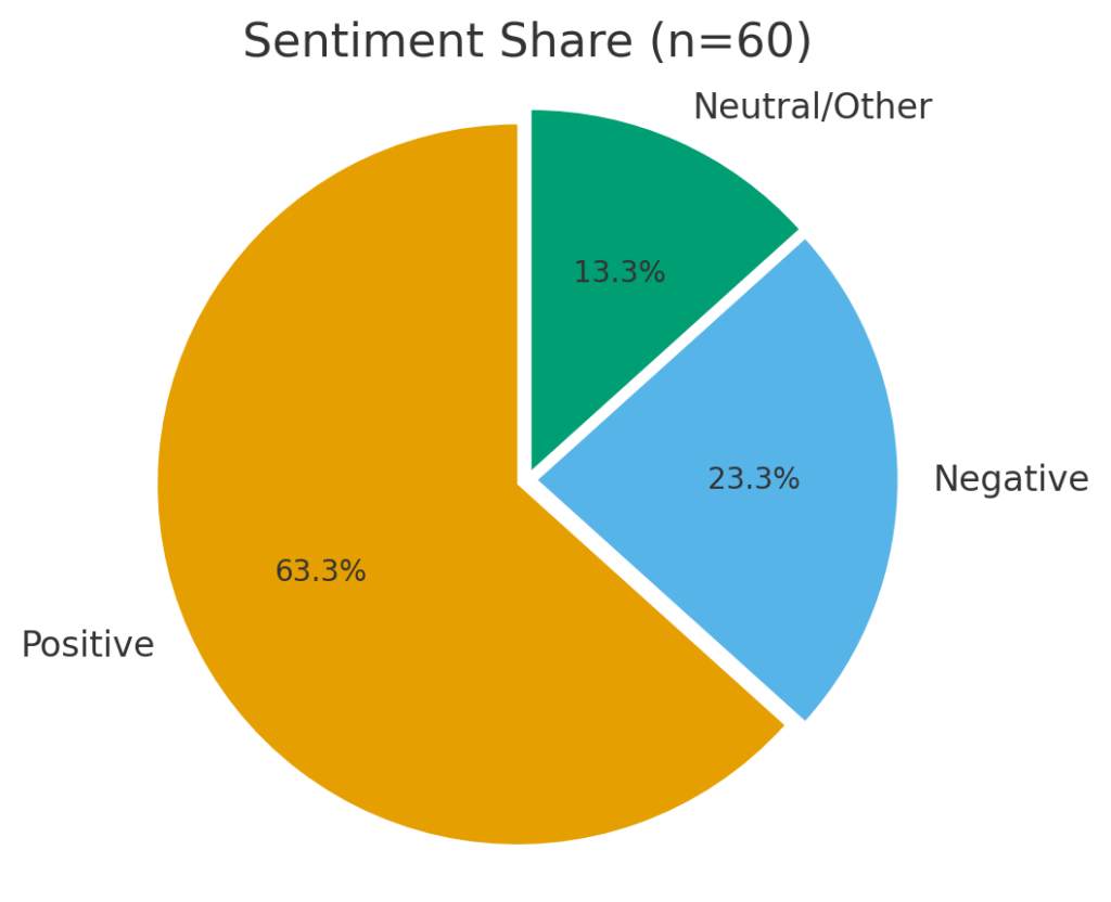 - çŽè¿60ä»¶ã®ã¬ãã¥ãŒã§ã¯è¯ãè©å€63.3%ãæªãè©å€23.3%ããã®ä»13.3%ã«åé¡ããã
